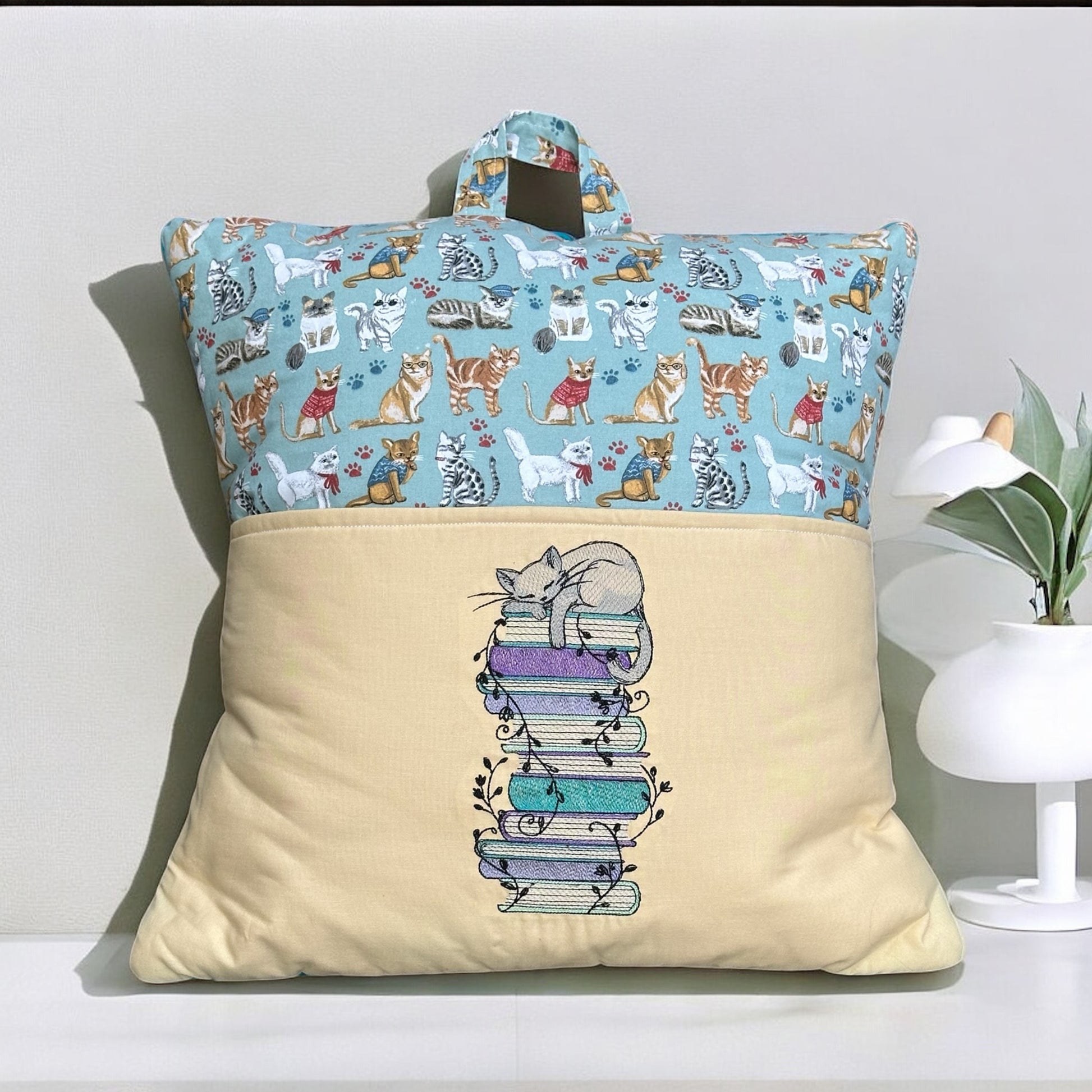 Handcrafted Reading Pillow - Cat Lounging on Stack of Books