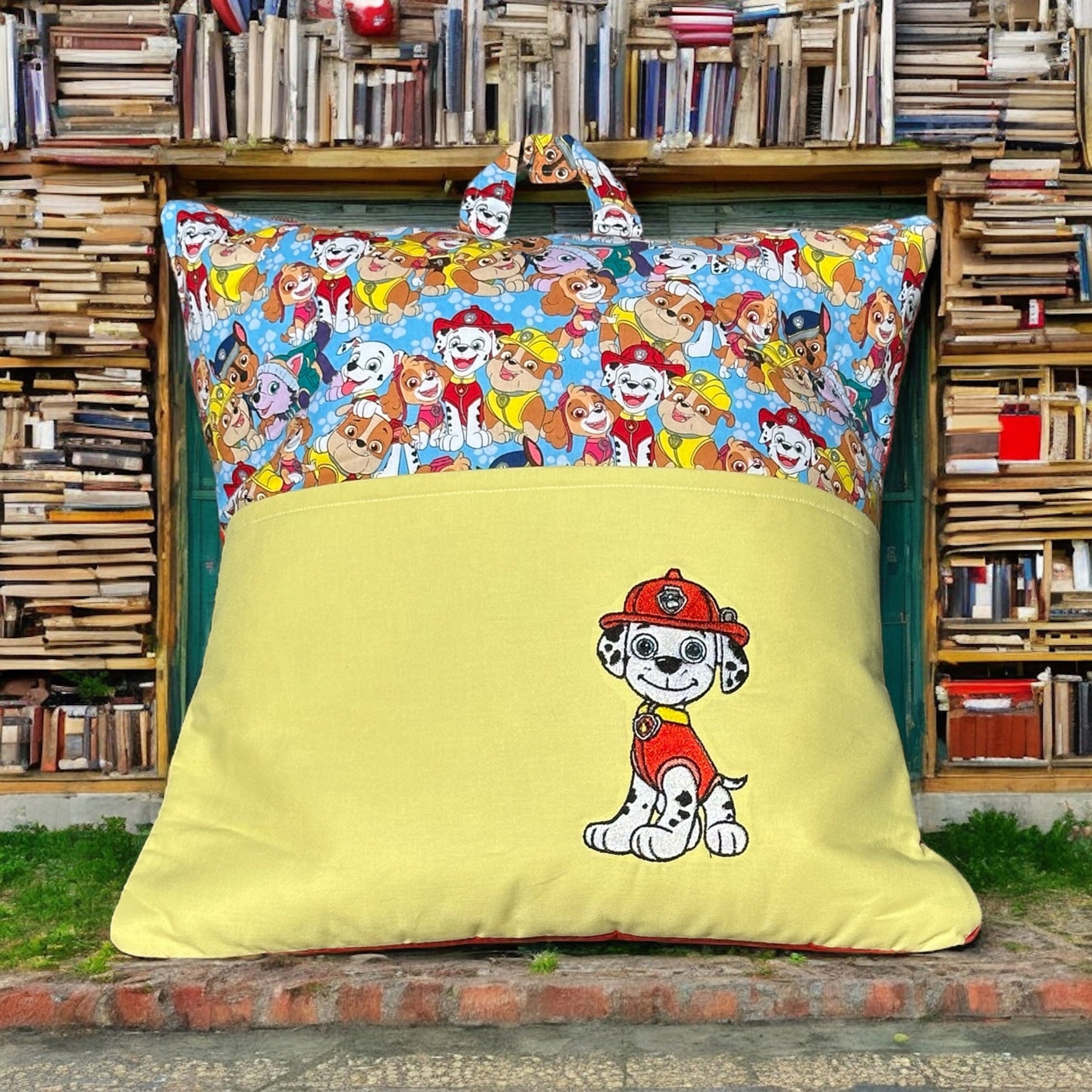 This handcrafted reading pillow features a detailed embroidered firefighter pup against a vibrant Paw Patrol-themed backdrop, combining charm with quality craftsmanship. Measuring approximately 18" by 18", it offers both comfort and style, making it an ideal accessory for enhancing any room or creating a cozy reading nook. Its durable construction ensures long-lasting use, while the playful design adds a touch of personality to your space, perfect for fans of Paw Patrol or those seeking a unique decorative piece.