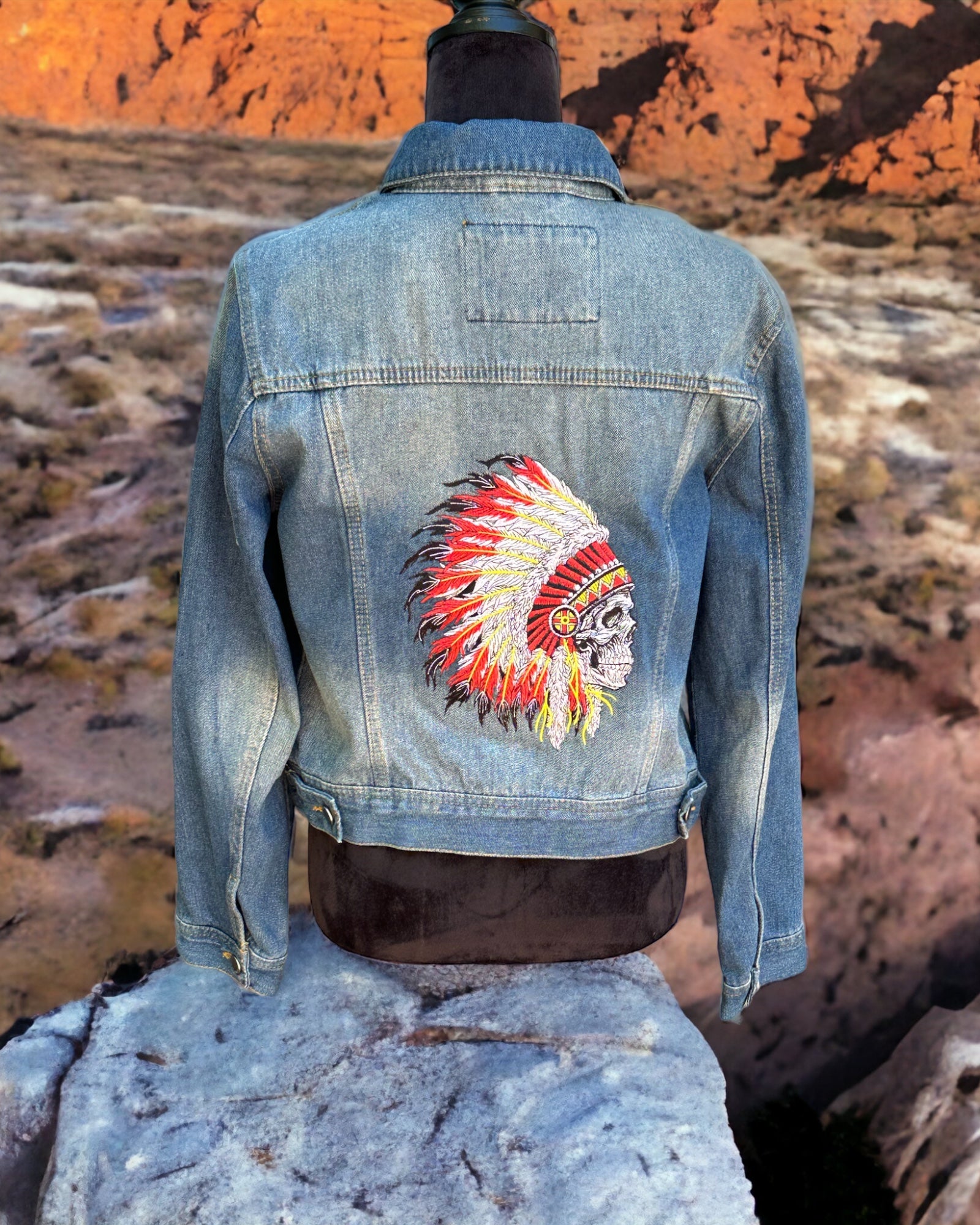 Beautifully embroidered denim jacket with native skull with red, black, white and yellow headdress. The skull is detail to show blue veins. Shell is 74% Cotton, 16% polyester, 9% rayon, 1% spandex